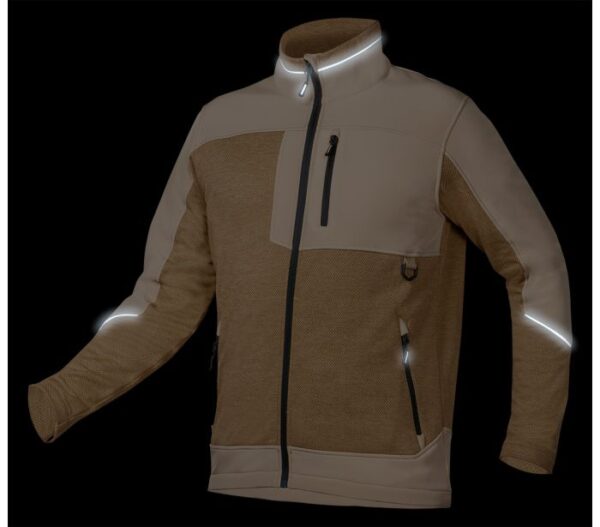 wstawki z softshella na rąbkach, stójce, rękawach, kieszeni i dole bluzy,
