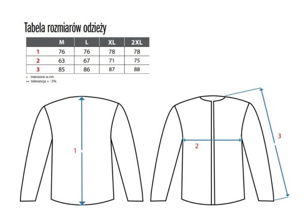 Ostrzegawcza kurtka ocieplana w talii, 2w1, wodoodporna i wiatroodporna, paski odblaskowe, klejone szwy, zapinana na zamek Lego, odpinane rękawy z regulowanymi i wewnętrznymi mankietami, kaptur w kołnierzu, wewnętrzny kołnierz z polaru, elastyczny pas, 2 dolne kieszenie, dwie kieszenie na piersi zapinana na rzep, z lewej strony szlufka do przypięcia dowodu osobistego, z prawej szlufka na radiostację, jedna kieszeń wewnętrzna.