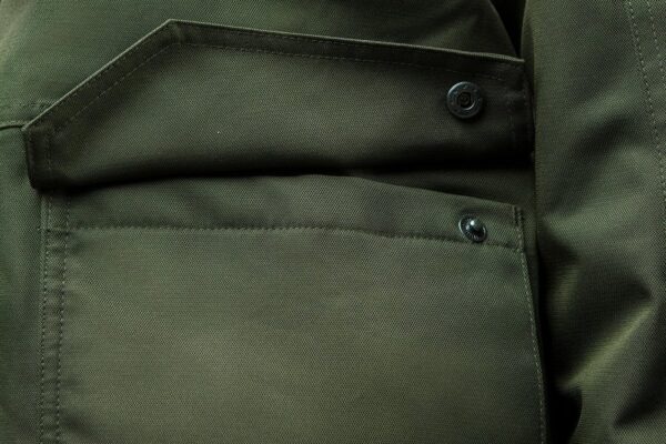 Posiada kieszeń wewnętrzną, piersiową i podwójne kieszenie: wierzchnia zapinana na zatrzask, spodnia na suwak.