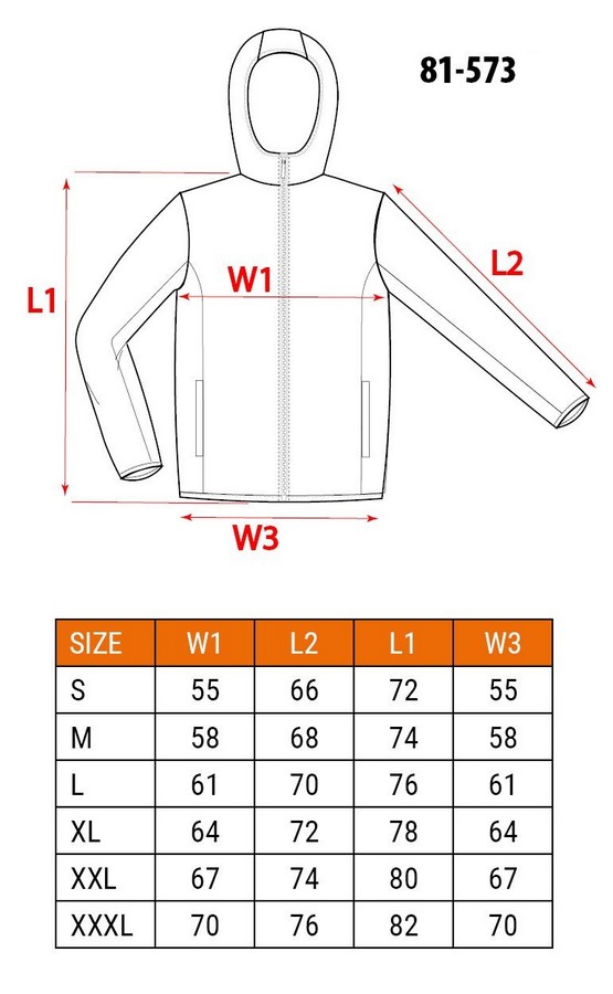 Kurtka została wyposażona w kaptur z regulacją chowany w stójce, regulację rękawów na rzep oraz regulację obwodu pasa.