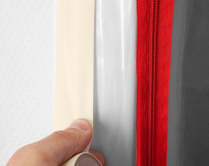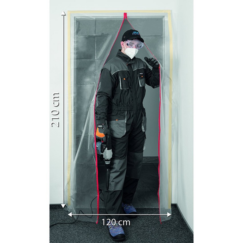 Kurtyna, osłona przeciwpyłowa z zamkiem „I” PE 49-801 marki NEO przeznaczona do otworów drzwiowych, wykonana z grubej, bezbarwnej i przezroczystej folii PE. Część otwierana kurtyny za pomocą zamka błyskawicznego ma kształt litery ,,I”. Mocowana za pomocą dwustronnej taśmy klejącej. Konstrukcja osłony nie posiada progu, dzięki czemu możliwe jest przeprowadzenie przez zabezpieczone drzwi wózka lub taczki. Kurtyna ma wymiary 1210 x 2140 mm. Skutecznie chroni pomieszczenia przed zapyleniem i zabezpiecza wnętrza podczas prac remontowych. Produkt marki NEO polecany jest do wielokrotnego użytku.