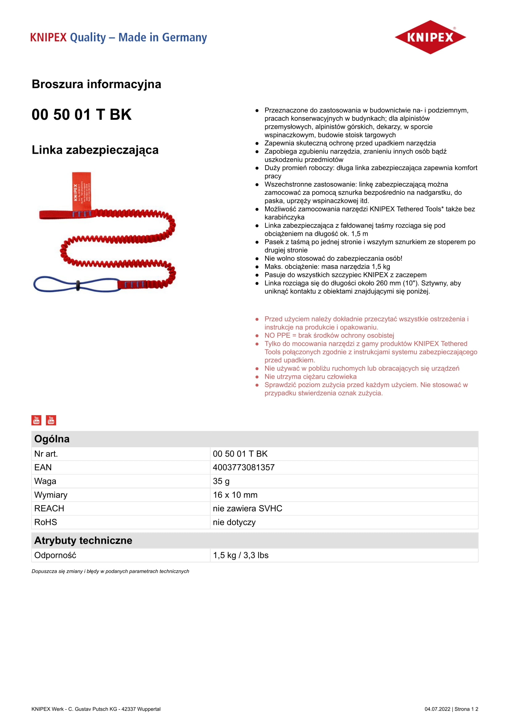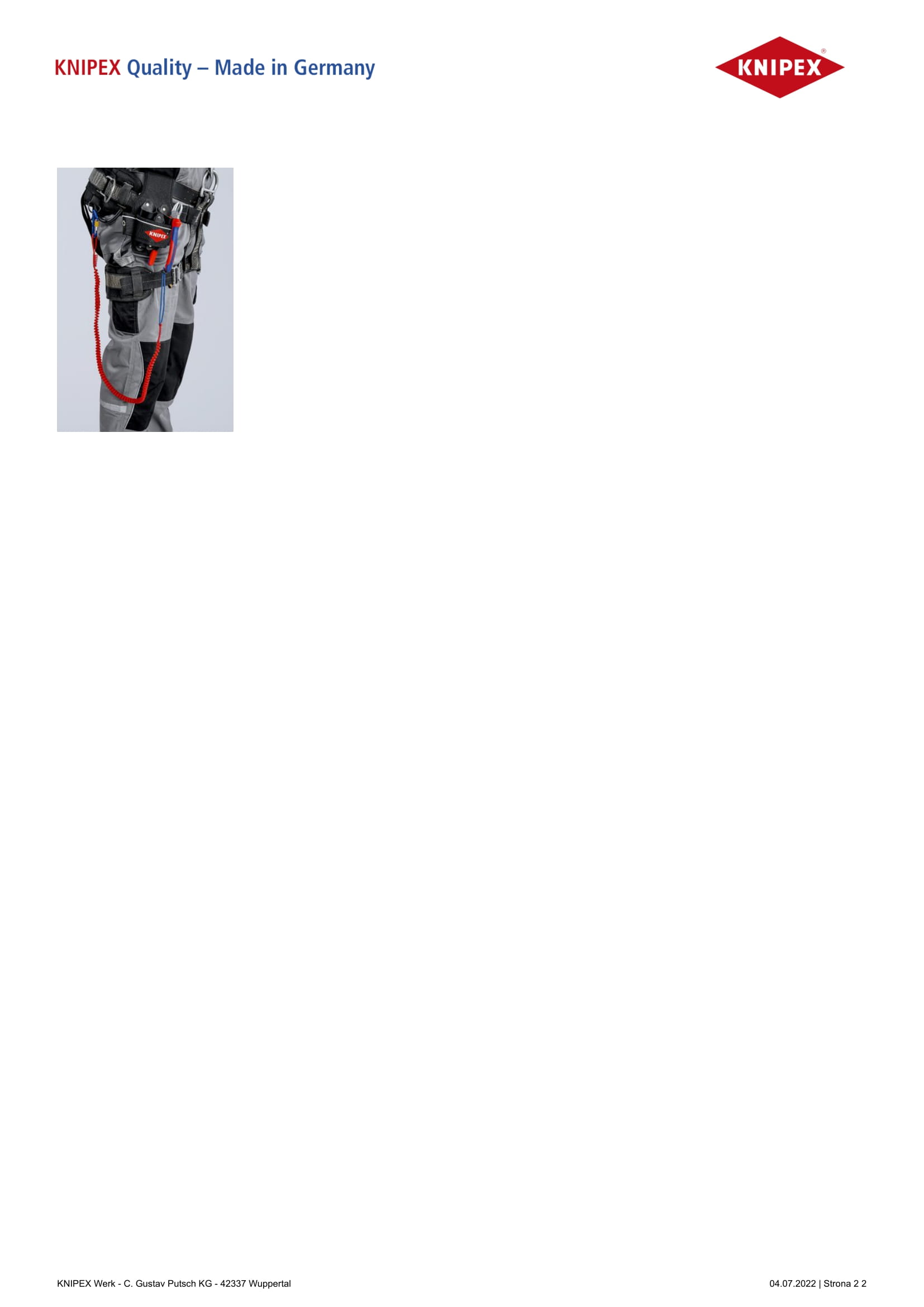 Tylko do mocowania narzędzi z gamy produktów KNIPEX Tethered Tools połączonych zgodnie z instrukcjami systemu zabezpieczającego przed upadkiem.