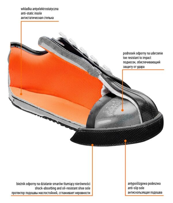Półbuty robocze NEO to podstawowa ochrona podczas pracy. Cholewka wykonana z przewiewnego materiału. Antypoślizgowa podeszwa wykonana z pianki EVA pokrytej gumą zapewnia wysoki komfort i skuteczne amortyzowanie wstrząsów, gwarantuje bezpieczeństwo i wygodę. Tył buta wzmocniony tworzywem oraz metalowy nosek chronią przed urazami mechanicznymi. Dzięki miękkiemu wykończeniu wewnątrz buta komfort pracy pozostaje na wysokim poziomie. Oznaczenie CE to gwarancja bezpieczeństwa, dowodzi, że produkt spełnia wszystkie unijne wymagania. Marka NEO spełnia oczekiwania profesjonalistów.