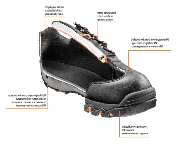 Półbuty zawodowe NEO to podstawowa ochrona podczas pracy. Cholewka wykonana z oddychającego materiału. Antypoślizgowa podeszwa wykonana z pianki EVA pokrytej gumą zapewnia wysoki komfort i skuteczne amortyzowanie wstrząsów, gwarantuje bezpieczeństwo i wygodę. Dzięki miękkiemu wykończeniu wewnątrz buta komfort pracy pozostaje na wysokim poziomie.