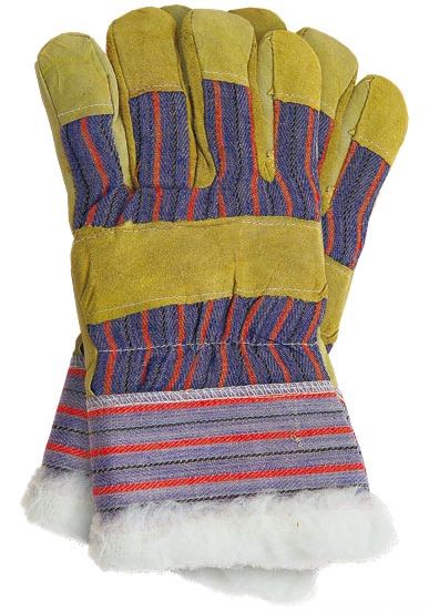 Rękawice ochronne ocieplane kożuszkiem wzmacniane skórą bydlęcą w kolorze żółtym.