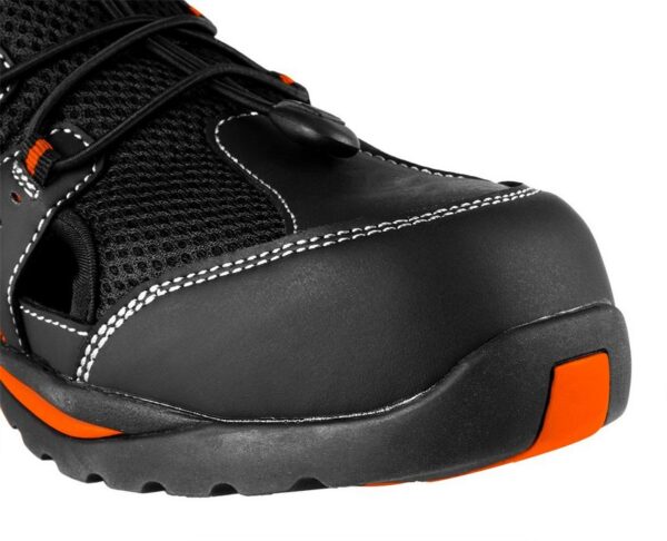 Sandały robocze S1 SRA, kompozytowy podnosek, marki NEO to nowoczesne obuwie z kategorią ochronną S1 SRA. Wyróżniają się odpornością na poślizg na podłożu ceramicznym pokrytym roztworem laurylosiarczanu sodu (SLS) – SRA oraz m.in. zabudowaną piętą i wkładką antyelektrostatyczną – S1. Obuwie posiadają kompozytowy podnosek oraz antypoślizgową podeszwę z Eva i gumy absorbującą wstrząsy, odporną na ścieranie, oleje, benzynę i inne rozpuszczalniki organiczne.