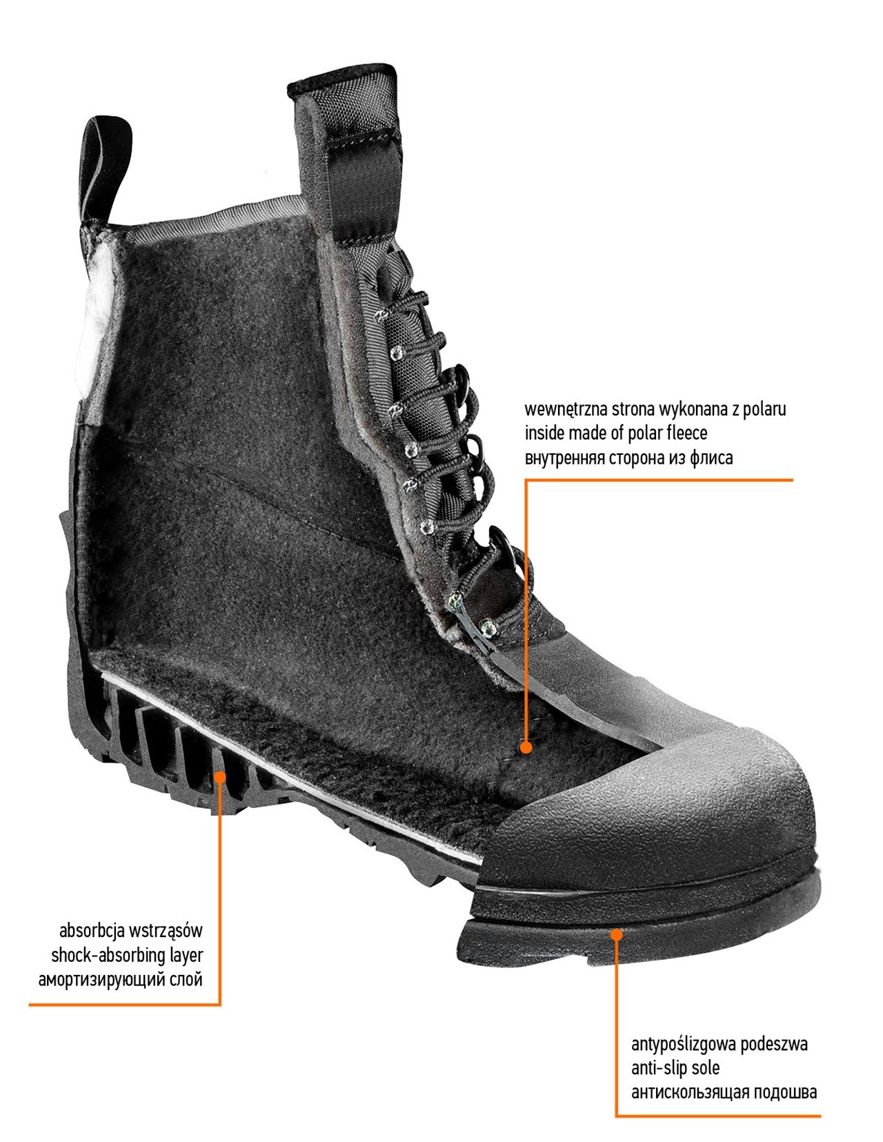 Wewnętrzne ocieplenie zapewnia wysoki komfort termiczny użytkownika a podeszwa antypoślizgowa zwiększa jego bezpieczeństwo podczas poruszania się po śliskiej nawierzchni.