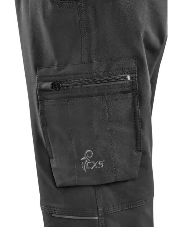 Spodnie wyposażone są w elastyczny pas z gumką i ściągaczem do regulacji rozmiaru, boczne kieszenie, tylną kieszeń na zamek, wielofunkcyjne kieszenie na udach oraz mniejszą kieszeń listwową na drobne przedmioty.