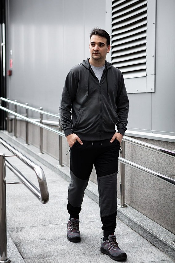 Spodnie dresowe COMFORT, czarno-szare, marki NEO TOOLS to spodnie z dzianiny dresowej pętelkowej w kolorze grafitowo-szarym. Wykonane z 57% bawełny, 39% poliestru oraz 4% elastanu. Charakteryzują się gramaturą 320 g/m2. Miękka guma w pasie oraz sznurek ułatwiają dopasowanie. Spodnie NEO TOOLS wyposażone zostały w 3 kieszenie na zamek – dwie kieszenie przednie oraz jedną kieszeń tylną. Wzmocnienia na kolanach, a także pas i ściągacze na nogawkach z materiału głównego wpływają na uniwersalność odzieży. Metka żakardowa z logiem i dopasowany krój to kolejne atuty tych spodni. Produkt projektu własnego marki NEO TOOLS posiada zgodność z certyfikatem CE. Sprawdzi się w wielu zadaniach zawodowych jak i na co dzień.