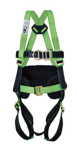 Szelki bezpieczeństwa z roboczym pasem pozycjonującym.,dwa pierścienie w kształcie litery D–piersiowy i grzbietowy wykonane ze stali o dużej wytrzymałości,dwa pierścienie w kształcie litery D,w obrębie pasa do pozycjonowania,regulowane pasy na ramio