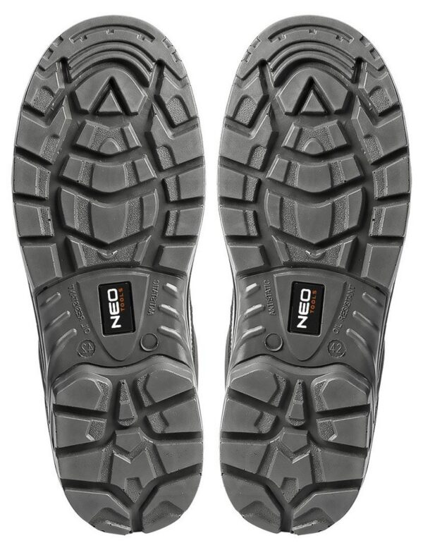 Antypoślizgowa podeszwa z systemem absorbującym wstrząsy, odporna na ścieranie, oleje, benzynę i inne rozpuszczalniki organiczne oraz podnosek z włókna szklanego wytrzymujący uderzenie do 200j,
