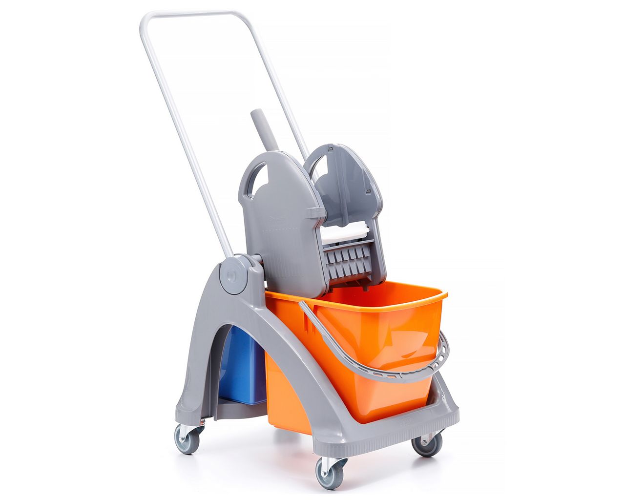 – Wyposażony w dwa wiadra o pojemności 25 i 6 litrów, dzięki czemu możliwa jest praca w systemie wózka dwuwiadrowego, tzn. w jednym wiadrze jest roztwór roboczy, a w drugi woda do płukania mopa.