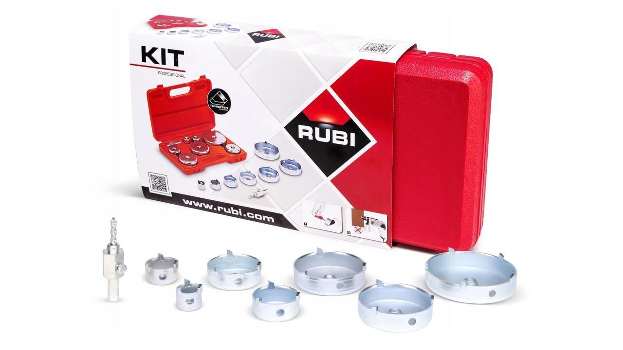 Zestaw wierteł z węglika wolframu składa się z: głowicy z wiertłem centrującym, wierteł o średnicy 27, 35, 45, 55, 65, 70 i 85 mm, oraz praktycznej walizki.